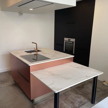 Agencements d'entreprise : Des bars contemporains qui deviennent le cœur des établissements professionnels, et des bornes d'accueil qui marquent les esprits.